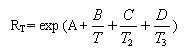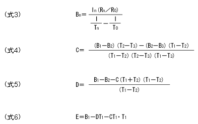 常數(shù)C、D、E可(kě)由4點的(de)(溫度、電(diàn)阻值)數(shù)據 (T0, R0). (T1, R1). (T2, R2) and (T3, R3),通(tōng)過式3~6計(jì)算(suàn)。